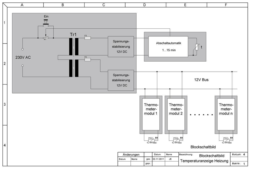 Wie im Blockschaltbild zu erkennen, liegt der Trafo TR1 nach Tastendruck auf den Netztaster an 230V, und versorgt dadurch die Abschaltautomatik mit 12V. Das Relais K1 zieht an und hält die 230V Spannungsversorgung aufrecht, auch wenn der Netztaster wieder losgelassen wird. Über eine zweite Trafowicklung wird eine 12V Busspannung für die Thermometermodule 1 bis 7 bereit gestellt. Nach einer einstellbaren Zeitspanne fällt das Relais K1 in der Abschaltautomatik wieder ab, die 230V Netzspannung wird unterbrochen und die Schaltung fällt bis zum nächsten Tastendruck in den Ruhezustand zurück.