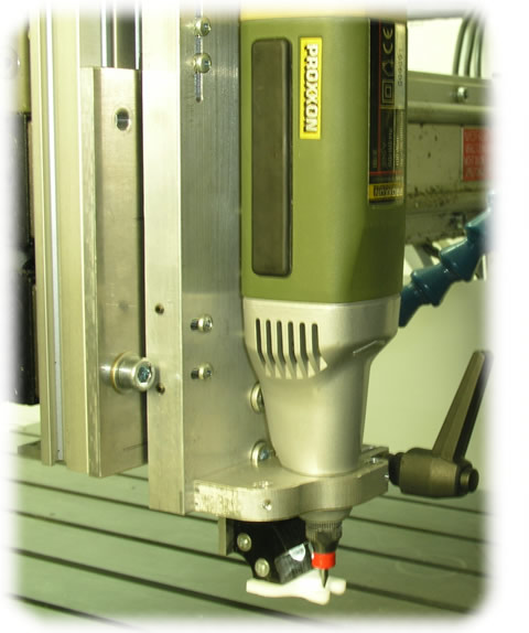Der Abstand zwischen Aussenkante der Z-Achse und Mitte des Fräsers beträgt 45mm, die Ausladung liegt damit nur um 15mm höher als ein direkt auf der Z-Achse montierter Fräsmotorhalter. Ich habe drei der Proxxon Fräsmotoren vom Typ IB/E, im Einsatz, in jedem ist ein anders Werkzeug eingespannt, somit verkürzt sich der Werkzeugwechsel zwischen Gravierstichel, Bohrer und Konturenfräser auf wenige Sekunden.