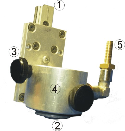 Das Angebot der Hersteller ist groß, aber auch nahezu identisch in ihrem Aufbau. Das rechte Bild zeigt ein Modell der Firma http://www.stepwalk.de/ Es ist mein erster Tiefensteller den ich mir gekauft hatte. Das ganze System wird über die Schiene [1] auf der Z-Achse der Fräse befestigt. Der komplette untere Teil ist dann über ein Linearlager schwimmend auf der Z-Achse gelagert und kann sich frei auf und ab bewegen. Der Fräsmotor (20mm Schaft) mit Gravierstichel wird jetzt von oben in Teil [4] eingesteckt, sodaß der Fräser minimal aus dem unteren Ring [2] heraus schaut. Der Ring [2] rutscht später auf dem zu gravierenden Material. Das Eigengewicht von Fräsmotor und Tiefensteller drückt den Fräser immer auf das zu gravierende Teil. Durch Verdrehen des Rings [2] schaut der Fräser mehr oder weniger weit heraus, die Frässpur wird dadurch breiter oder schmaler. Über Anschluss [5] lässt sich der Frässtaub absaugen.