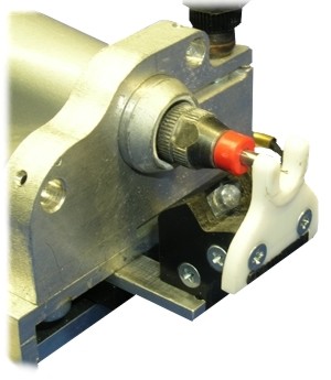 Basierend auf dem Prinzip einer Nähmaschine, bei der die Nadel immer gut sichtbar von einem kleinen Schuh umgeben ist, wird bei meinem Tiefensteller der Fräser von einem Teflonschuh umgeben, der direkt auf dem zu gravierenden Material gleitet. Lässt sich dieser Schuh im Verhältnis zu Fräserspitze über eine spezielle Mechanik noch millimetergenau in der Höhe einstellen, dann sind die wirklich großen und grundlegen Probleme in der Konstruktion beseitigt. Das Ergebnis meines Gravurtiefenreglers ist hier rechts zu sehen.